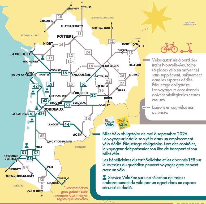 Le service VéloZen est proposé par la Région Nouvelle-Aquitaine de mai à fin juillet sur 4 lignes de trains. Il permet de confier votre vélo à un agent lors de la montée à bord. Votre vélo sera installé dans un espace dédié et sécurisé pouvant accueillir jusqu’à 25 vélos.